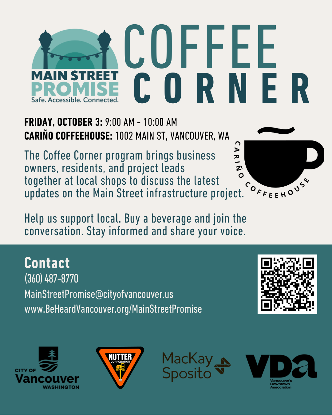 You're Invited! Downtown business owners, property owners, residents, and community members, please join us at our next Coffee Corner event held on October 3 from 9 AM to 10 AM at Carino Coffeehouse located at 1002 Main Street. Support local and meet the contractor and project team. Ask questions and learn more about the Main Street Promise. Find Coffee Corner details below under "Engagement Opportunities."
